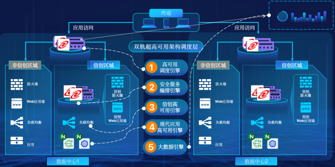 神州泛亚电竞在企业面临自主创新IT基础重构过程中,推出的全新架构双轨超高可用架构(简称DTMAA),在双活数据中心的分区调度基础上,添加每个数据中心内信创域和非信创域的分域调度,来实现分区分域协同的多活双轨超高可用。