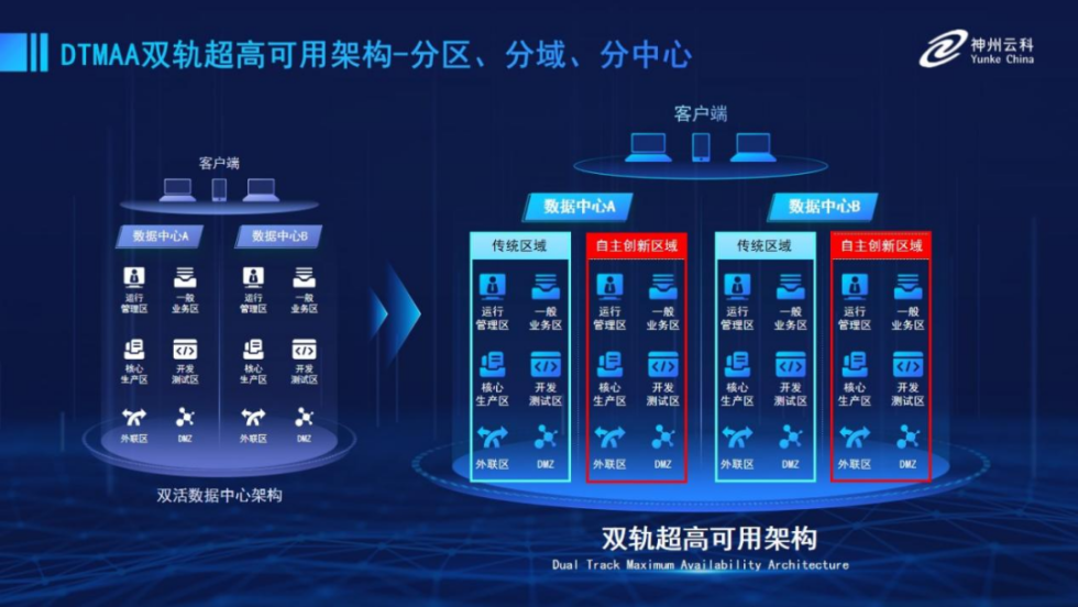 为帮助金融客户更好地应对数字经济时代对可持续性的高要求,实现“信创”与“数字化”齐头并进,神州泛亚电竞推出了双轨超高可用架构。该架构在双活数据中心的分区调度基础上,增加信创域和非信创域的分域调度,实行信创域与传统域应用全量部署,使双中心运营变为双中心四区域并行运行,互为多活,将“0到1”的单轨建设道路变为分区分域协同的多活双轨超高可用架构。帮助客户在新架构下,保障“信创”的同时解决性能瓶颈,提升稳定性,保证应用可持续性,最终实现信创区域和非信创区域的平滑过渡,完成国产化替代目标。