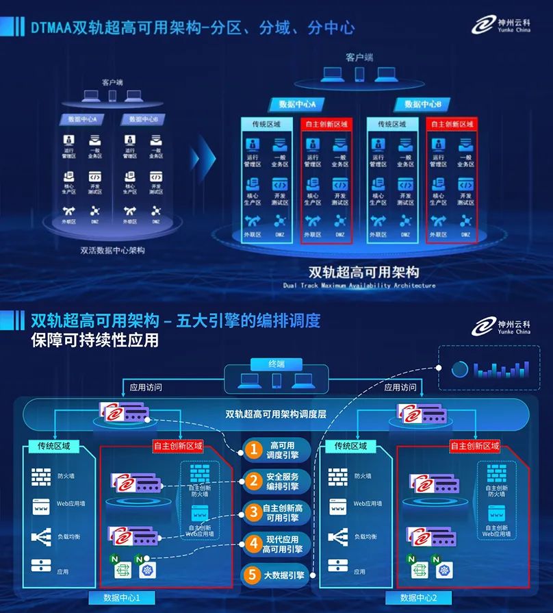 为助力银行业务高质量发展,更好地应对数字经济时代对可持续性的高要求,实现“信创”与“数字化”齐头并进,神州泛亚电竞创新性的推出了双轨超高可用架构。该架构在双活数据中心的分区调度基础上,增加信创域和非信创域的分域调度,实行信创域与传统域应用全量部署,使双中心运营变为双中心四区域并行运行,互为多活,将“0到1”的单轨建设道路变为分区分域协同的多活双轨超高可用架构。帮助客户在新架构下,保障“信创”的同时解决性能瓶颈,提升稳定性,保证应用可持续性,最终实现信创区域和非信创区域的平滑过渡,完成国产化替代目标。